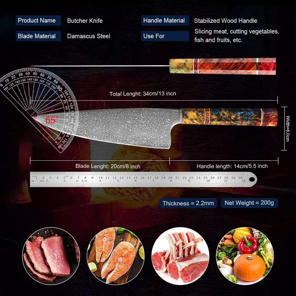 8 Inch Damascus Steel Slaughter Knife Large Chef’s Knife Sharp Kitchen Slicing Chop Meat Cutting Fillets Utility Full Tang