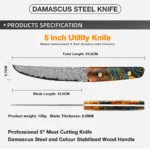 Damascus Steel Kitchen Utility Knife 5 Inch Full Tang Blade Super sharp Japanese VG10 Knife Ergonomic Stabilised Wood Handle