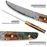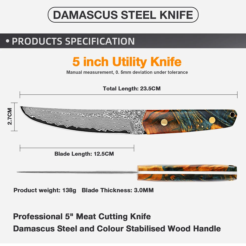 Damascus Steel Kitchen Utility Knife 5 Inch Full Tang Blade Super sharp Japanese VG10 Knife Ergonomic Stabilised Wood Handle