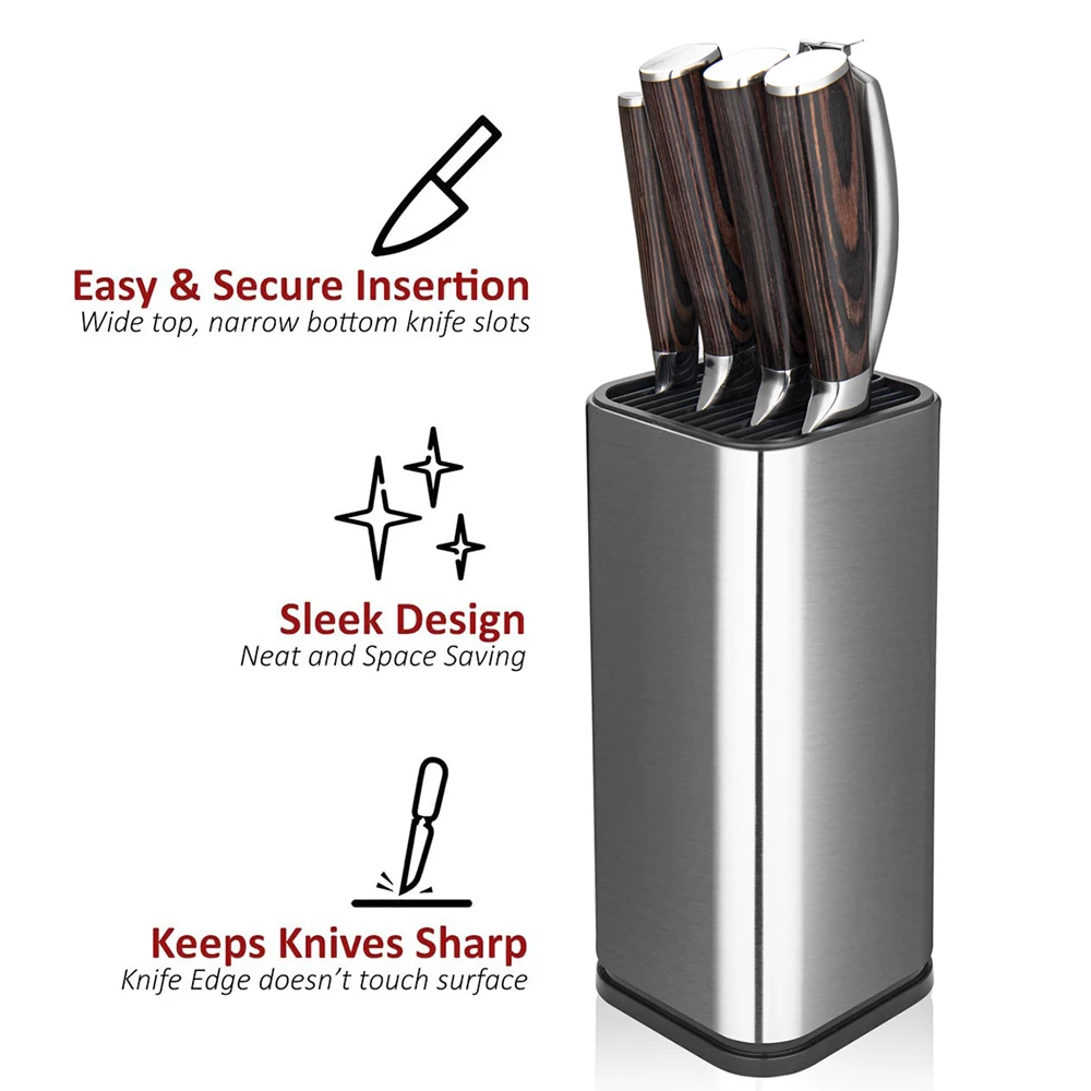- [Drainage hole, easy to clean] There is a drainage hole at the bottom of the knife holder. This helps to drain after washing the knife. Simply wipe the stainless steel surface or rubber lining to keep the seat clean.