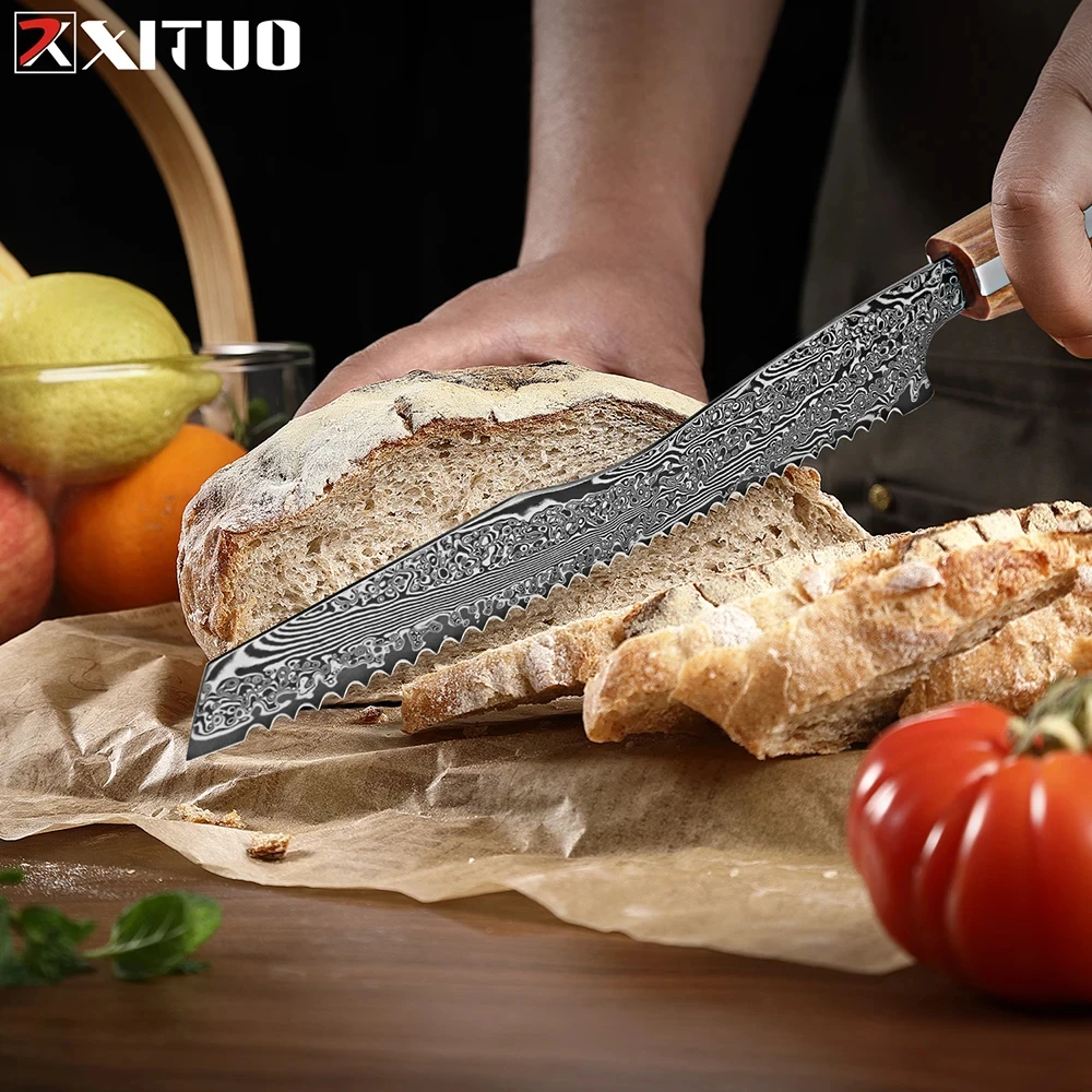 High-end 67-layer Damascus Steel 8-inch Bread Knife Serrated Sharp Non-stick Edge Professional Cake Knife Kitchen Baking Tools