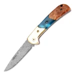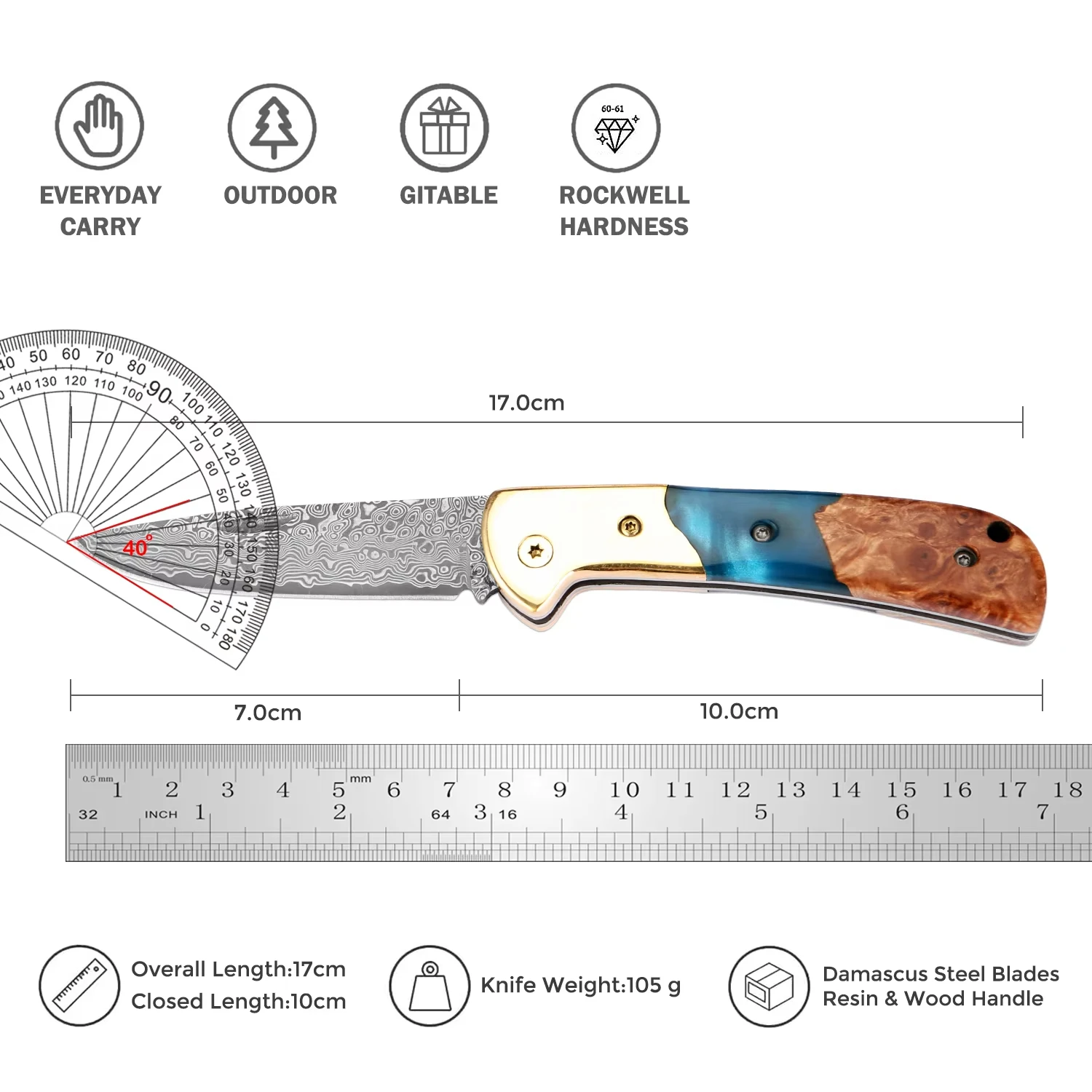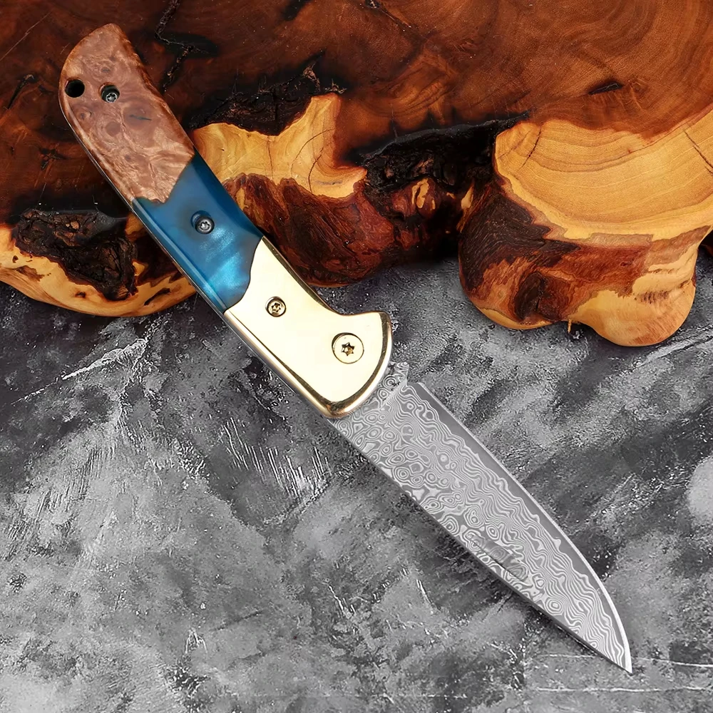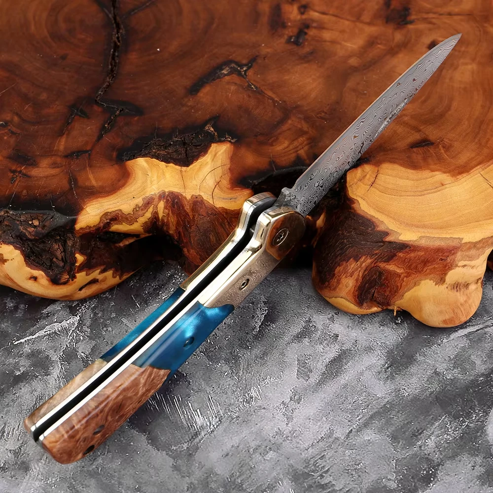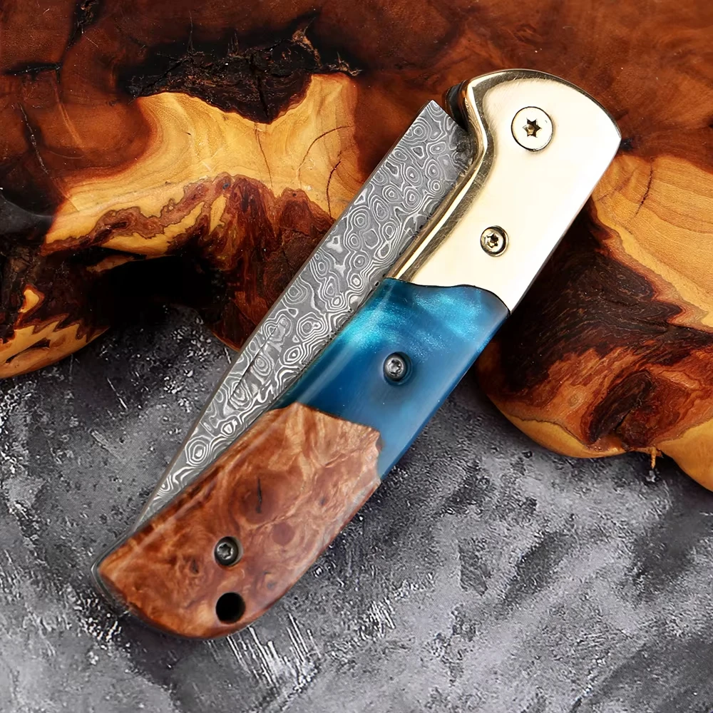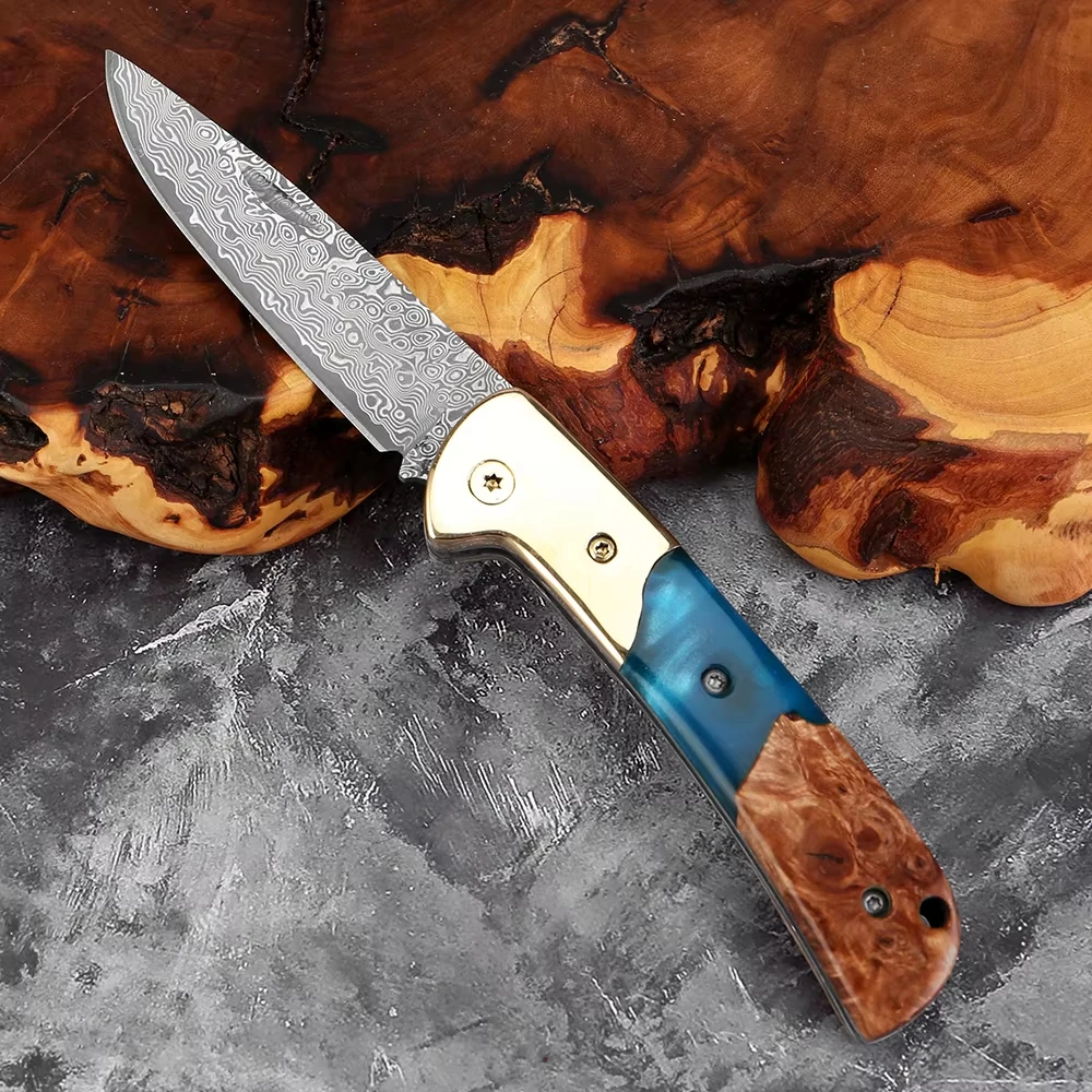 Luxury Damascus Steel Folding Knife with Unique Wave Pattern Blade Stainless Steel & Resin & Wood Handle Outdoor EDC Waist Knife