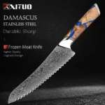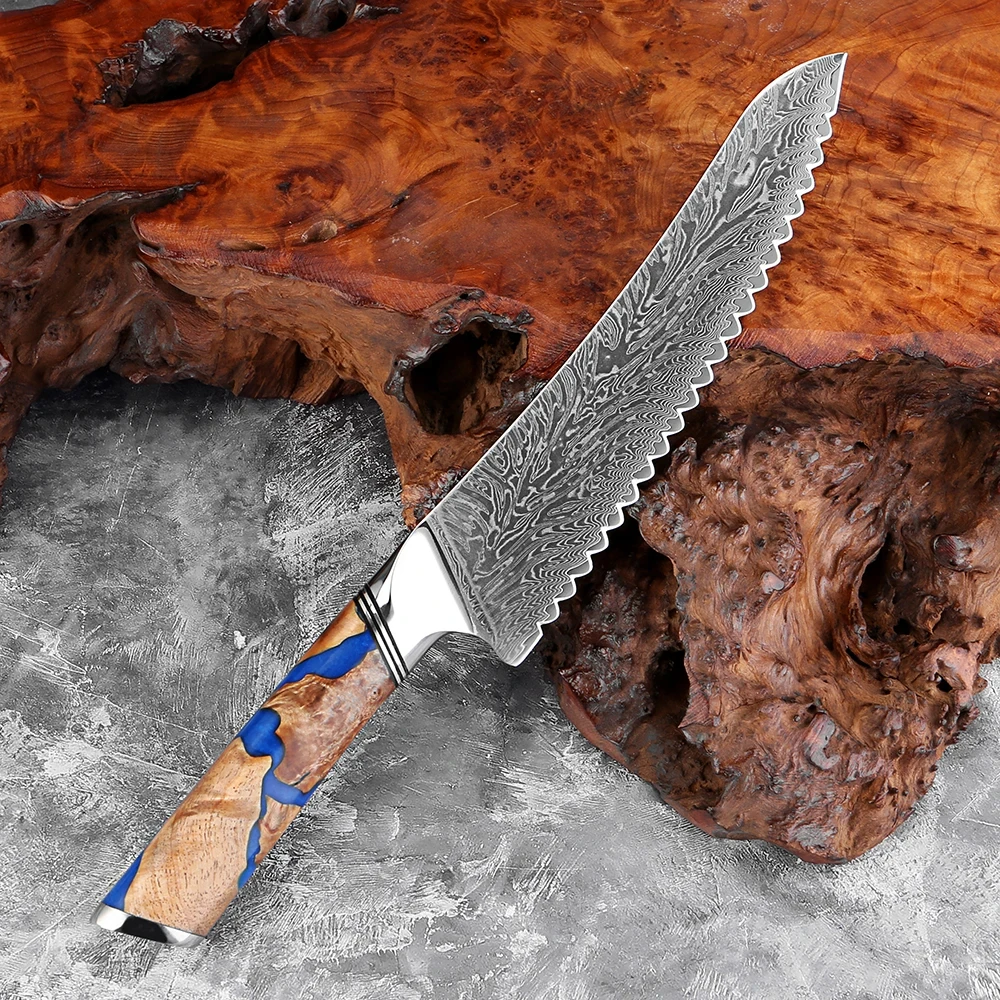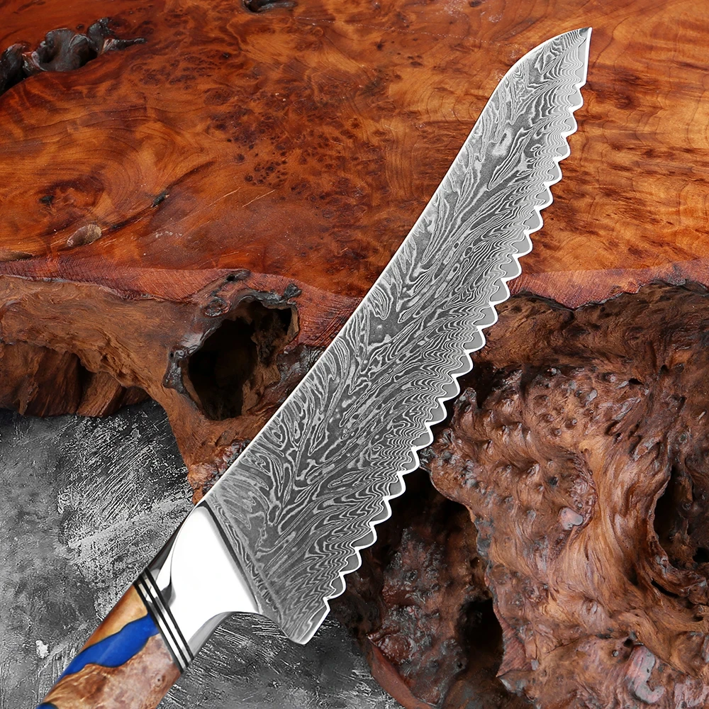 New 67-Layer Damascus Steel 8-Inch Bread Knife with Sharp Serrated Blade for Cakes Toast and Baking Features an Ergonomic Handle
