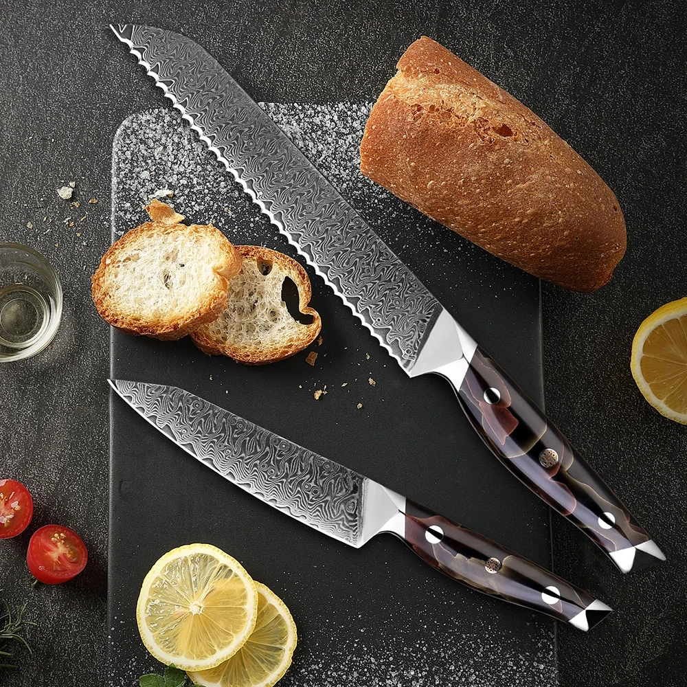 New Damascus Stainless Steel Bread Knife Razor Sharp Serrated Steak Knife Gorgeous Copper-platinum Resin Handle Cutting Tool