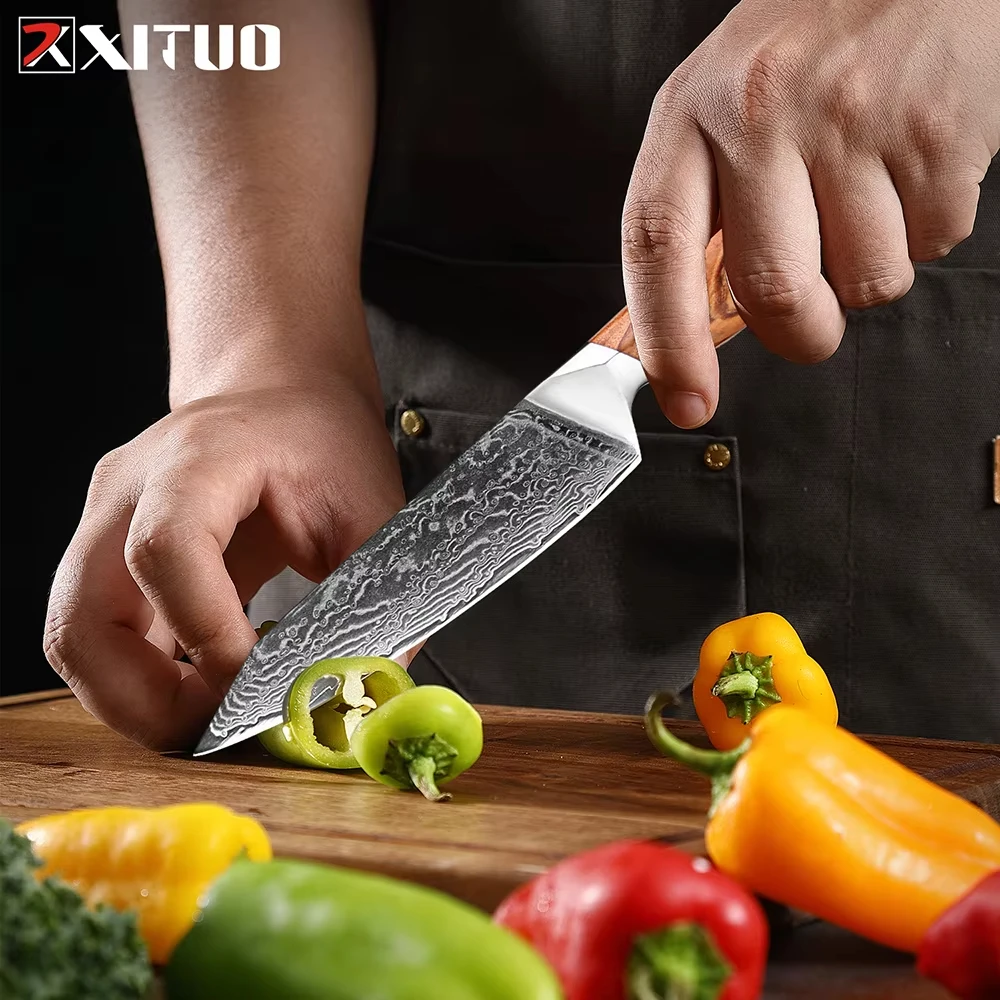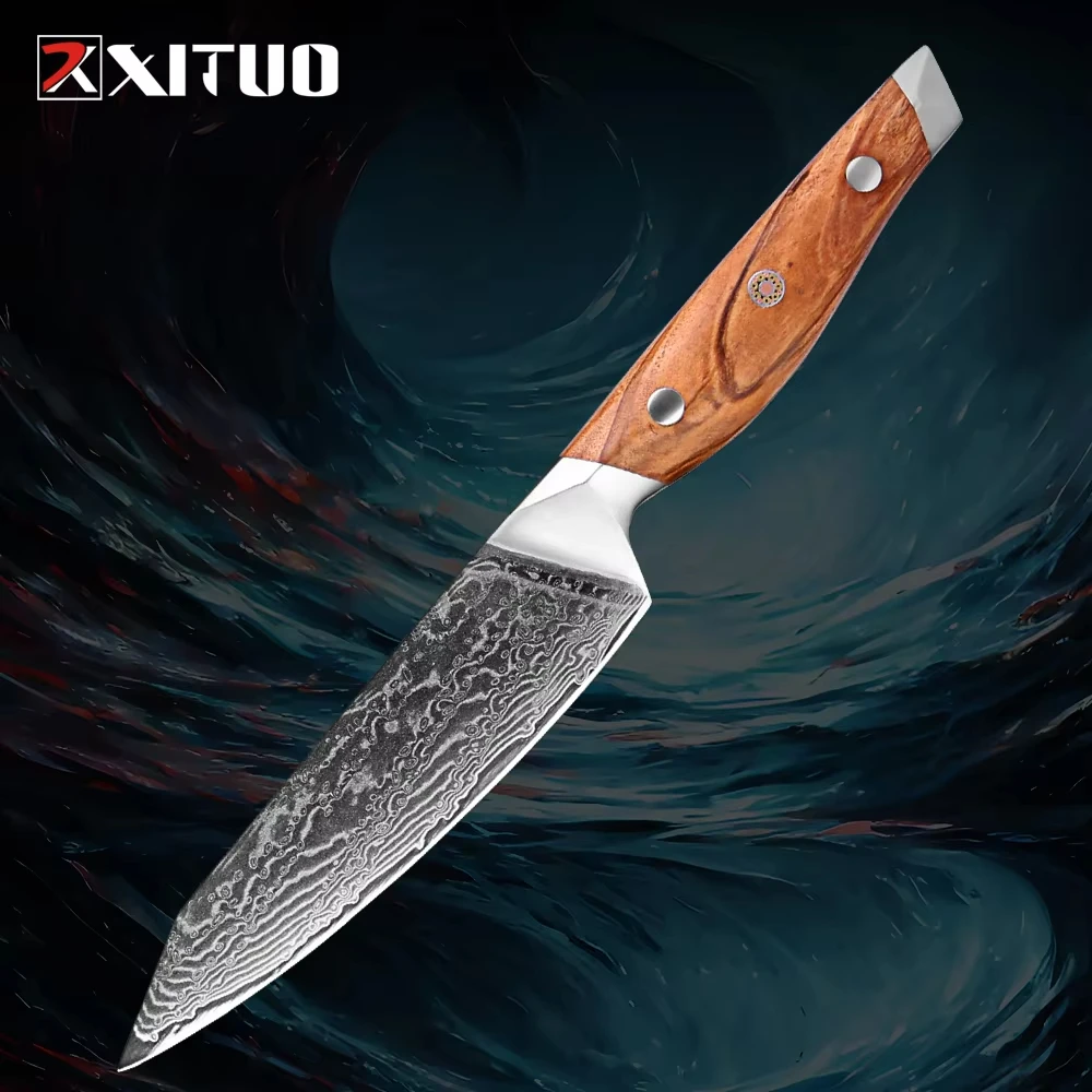 XITUO 5-inch Utility Knife Damascus Steel Kitchen Knife for Household sharp Fruit Slicing and Paring Knife Olive Wood Handle