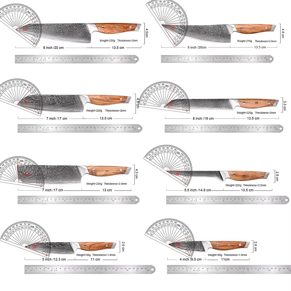 A: We specialize in the production of cost-effective knives, medium and high-end composite steel knives.Such as China 7Cr17Mov stainless steel laser pattern knives, hand-forged knives,Damascus composite steel knives, German steel 1.4116…The handles are made of natural wood such as color wood, G10, Micarta,Pakkawood,rosewood, wenge wood, and olive wood.
