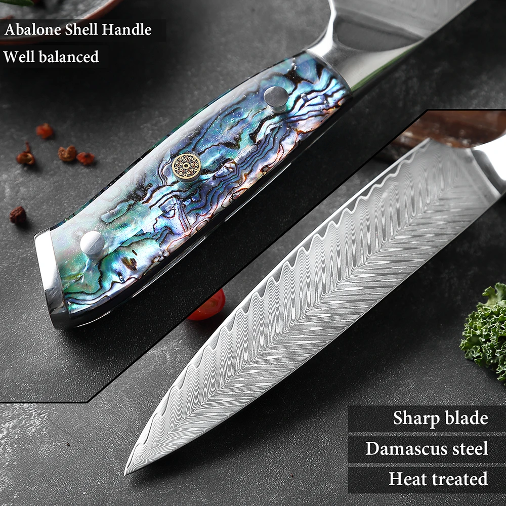 1.The blade is made of 67-layer Damascus Steel imported  from Japan and its handle material is Abalone Shell.