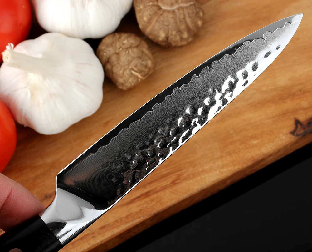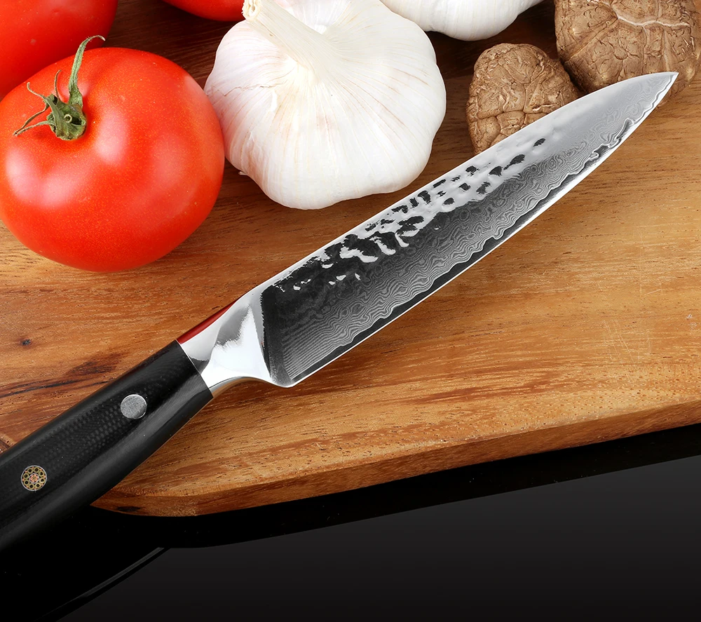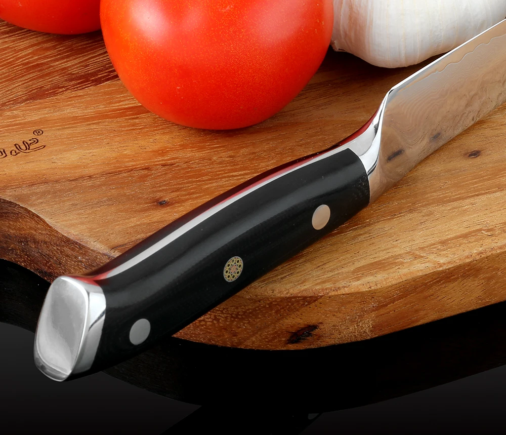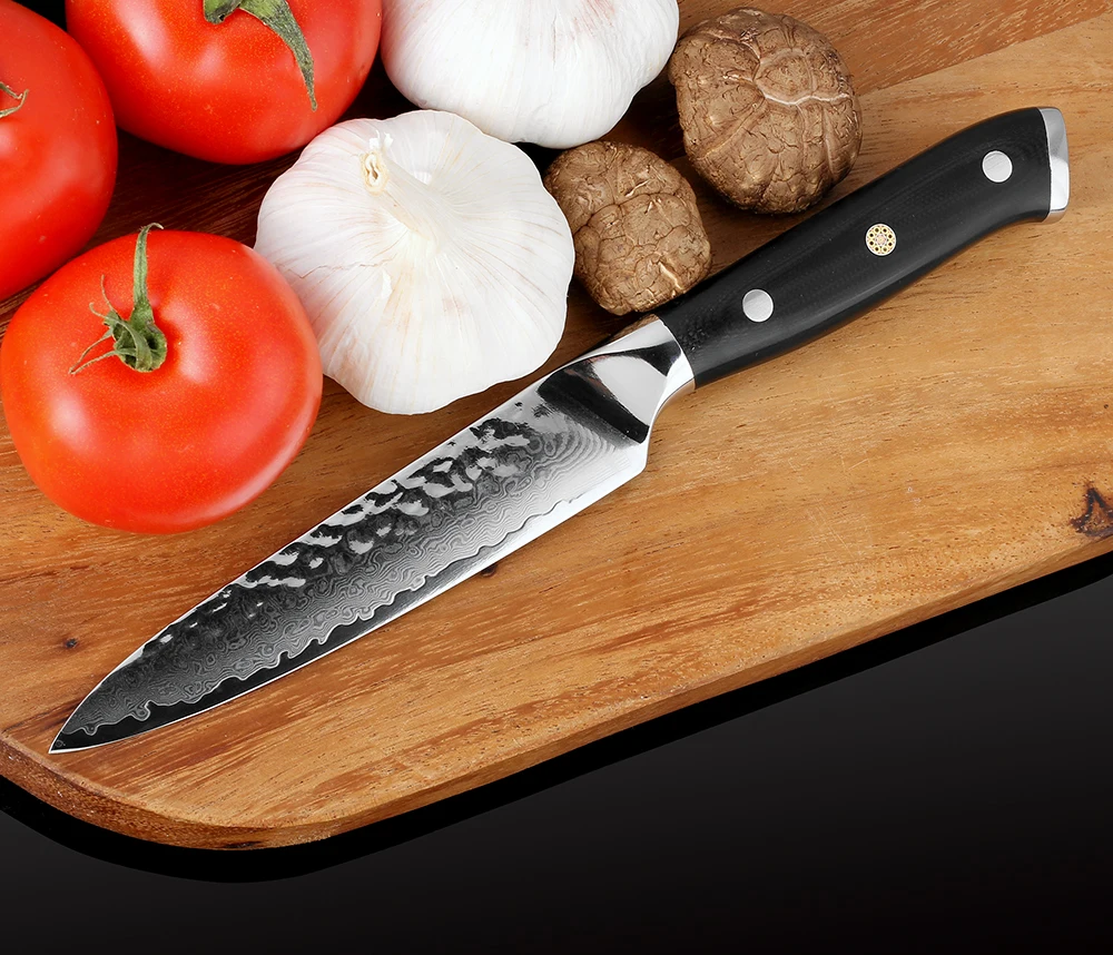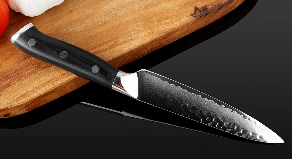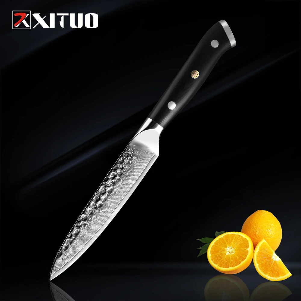 Product Description Name: XITUO 5" inch Slicing knife Full length: 23.5 cm (5 inch) Blade length: 12.5 cm Blade width: 2.4 cm (The widest point) Blade thickness: 2.4 mm Net weight: 132 g Hardness : 60 HRC. Material : Japanese 67 layers Damascus steel. Handle: high quality Black G10 + double steel head+Delicate plum nail Characteristics : sharp and durable; Super anti rust; Light energy. Material and craft : multilayer Damascus steel10Cr15CoMoV core optical lens processing forging process. Sharpness level : the level of cutting force: 6.0-8.0 N international standards. | ||