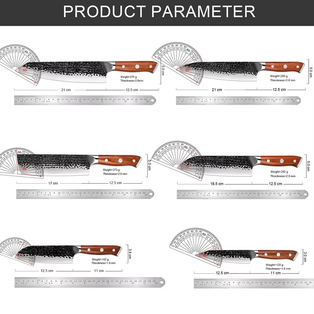 A: We specialize in the production of cost-effective knives, medium and high-end composite steel knives.Such as China 7Cr17Mov stainless steel laser pattern knives, hand-forged knives,Damascus composite steel knives, German steel 1.4116…The handles are made of natural wood such as color wood, G10, Micarta,Pakkawood,rosewood, wenge wood, and olive wood.