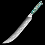 1. Quels sont les matériaux utilisés pour la lame et le manche ? La lame est en acier Damas à 67 couches, et le manche est en nacre d’ormeau naturelle.
